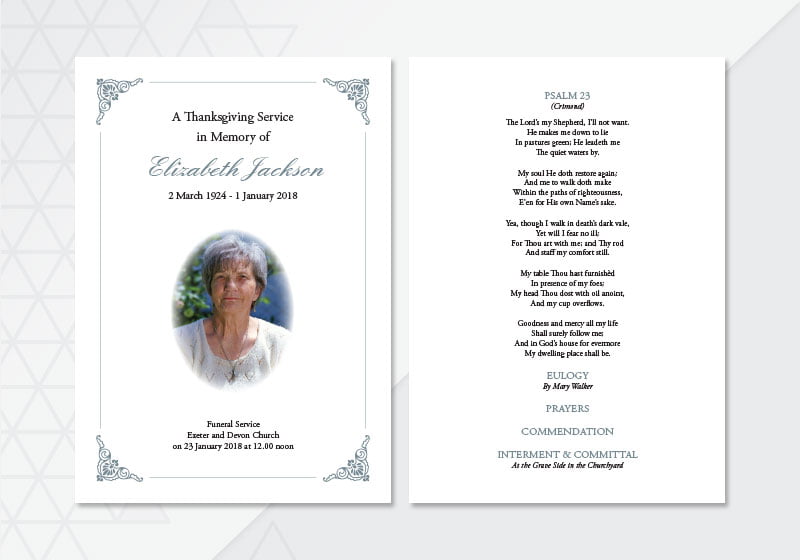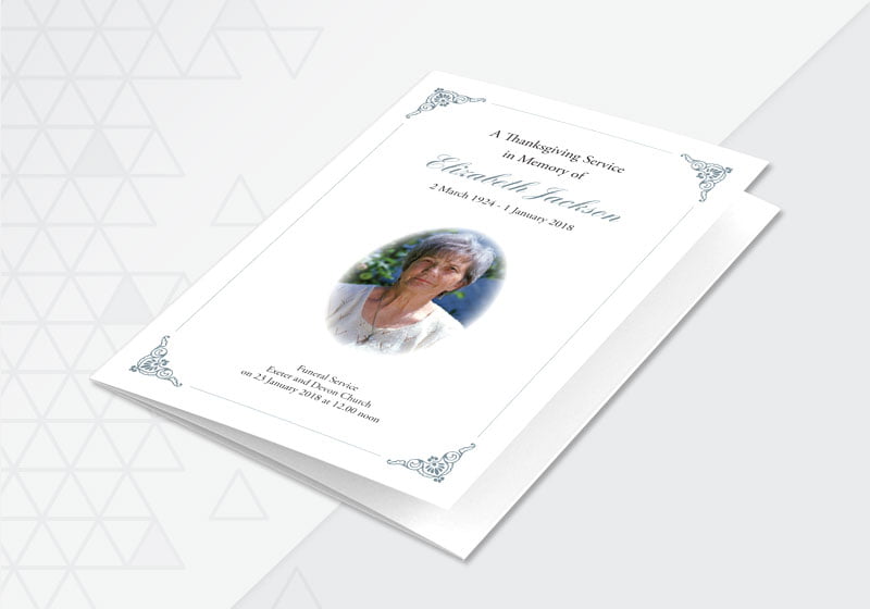 We offer an array of beautiful finishes for a unique document that you can treasure. Choose your preferred material and number of pages (4, 8 or 12 page booklet). Upload or send your images, hymns and service information and await your proof.