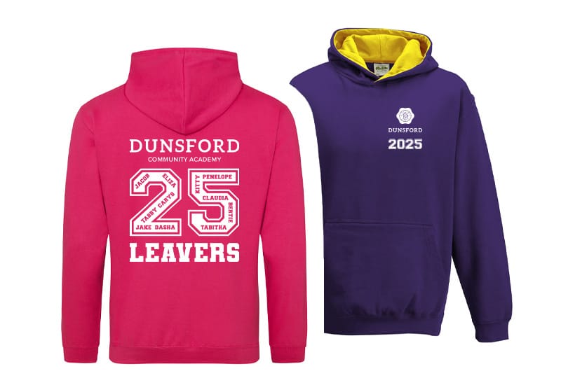 Leaving school is an important step in a child’s life, give them something to remind them of this milestone with a Dunsford Community Academy Leavers Hoodie. Choose from a Kids Hoodie or Varsity Hoodie with the contrast inner hood.