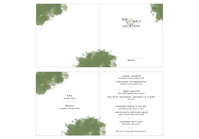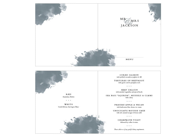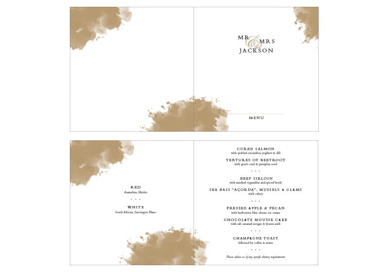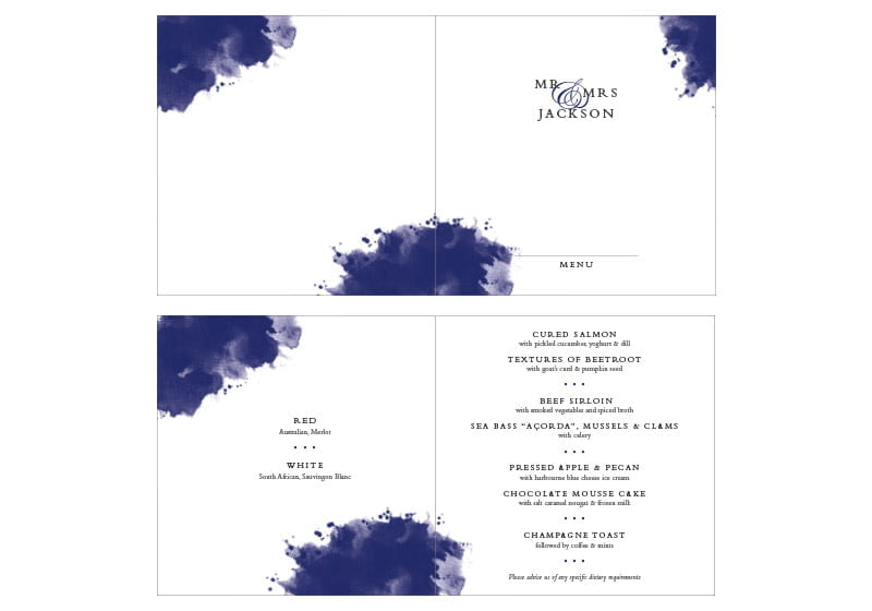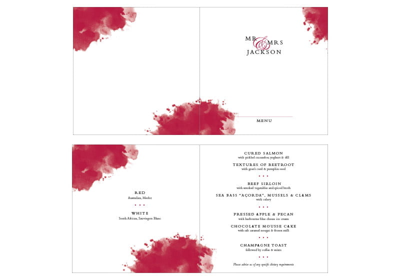 Our beautiful pre-designed wedding options enable you to have professionally designed Menu Cards on time and on budget.