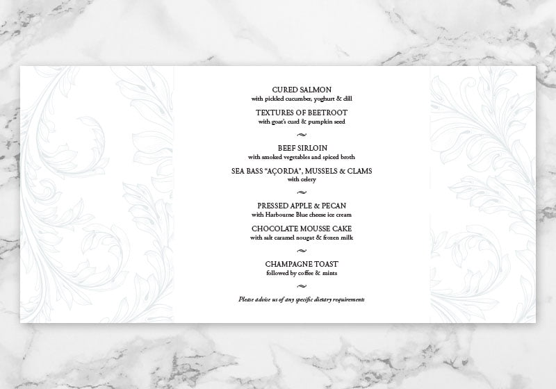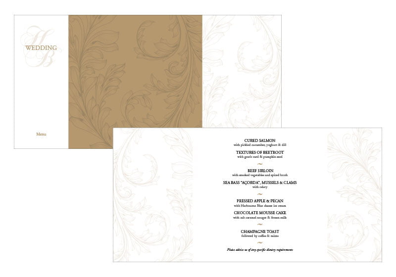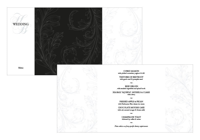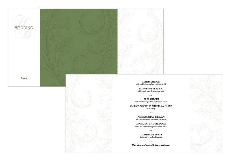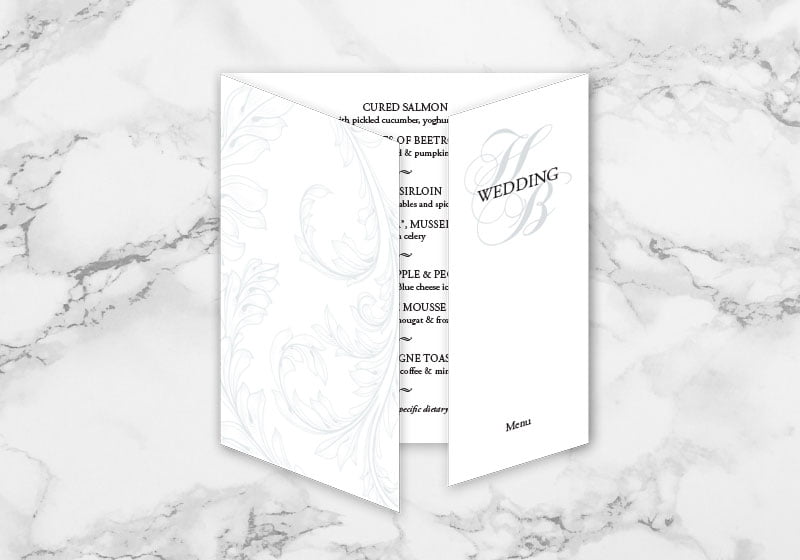 The Fantastic Flourish collection features an elegant flowing scroll motif and is available in an array of colours, printed on textured Conqueror Stonemarque Diamond White stock.