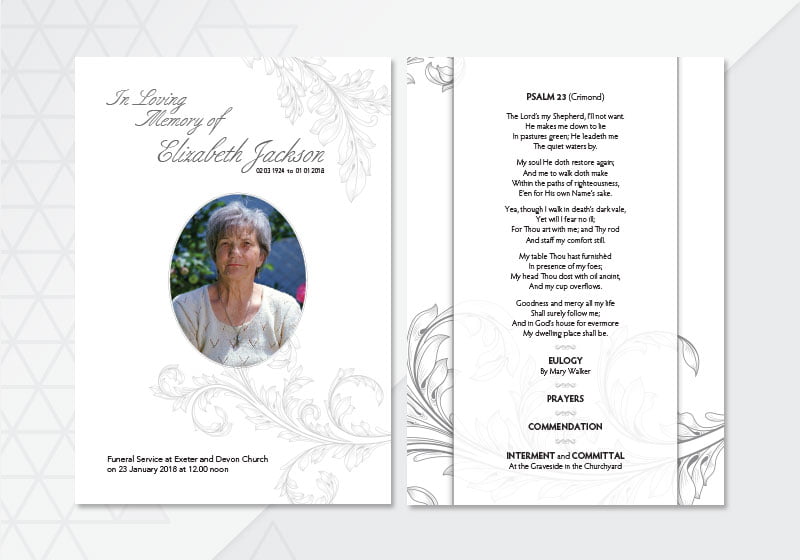 We offer an array of beautiful finishes for a unique document that you can treasure. Choose your preferred material and number of pages (4, 8 or 12 page booklet). Upload or send your images, hymns and service information and await your proof.