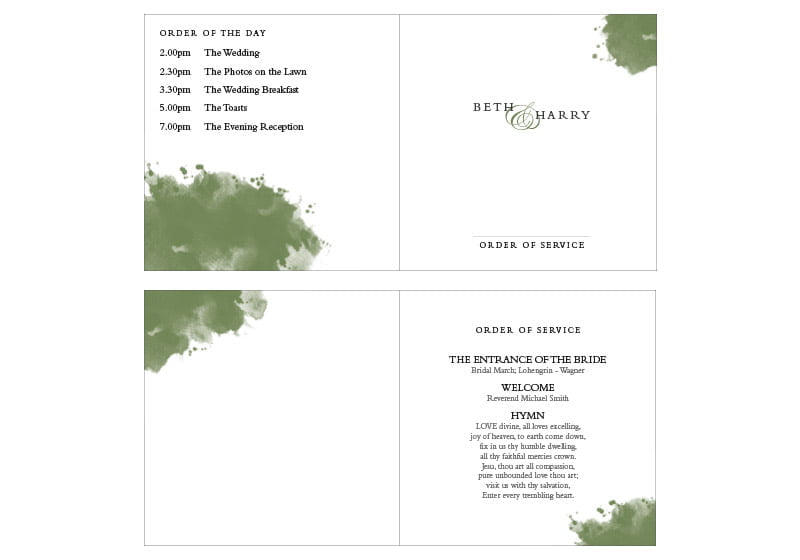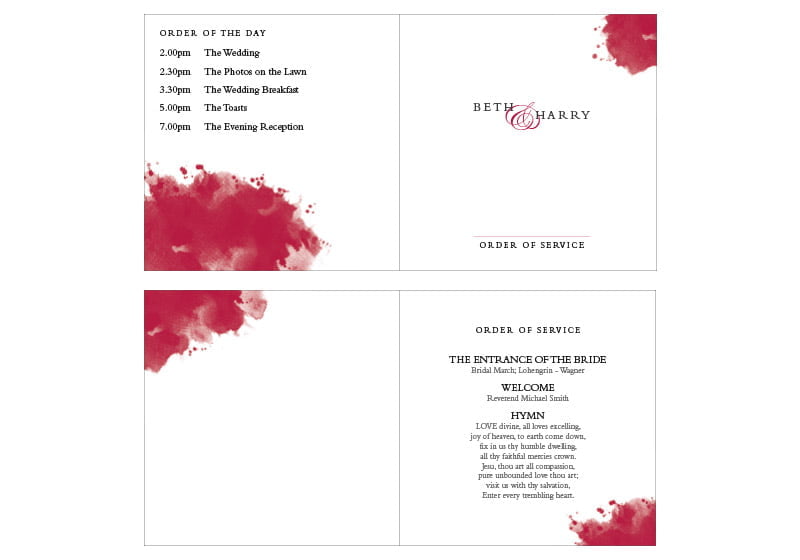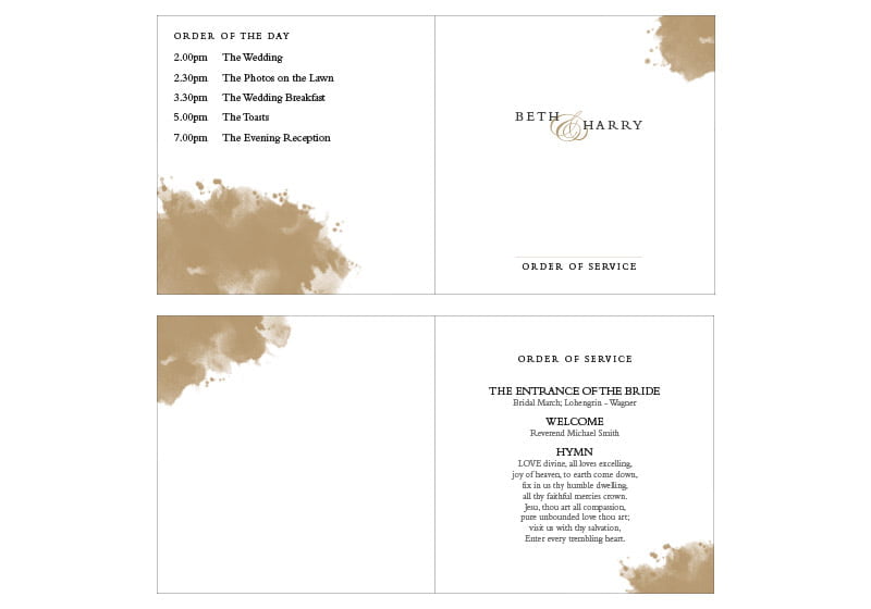 Our beautiful pre-designed wedding options enable you to have professionally designed Wedding Order of Service booklets on time and on budget.